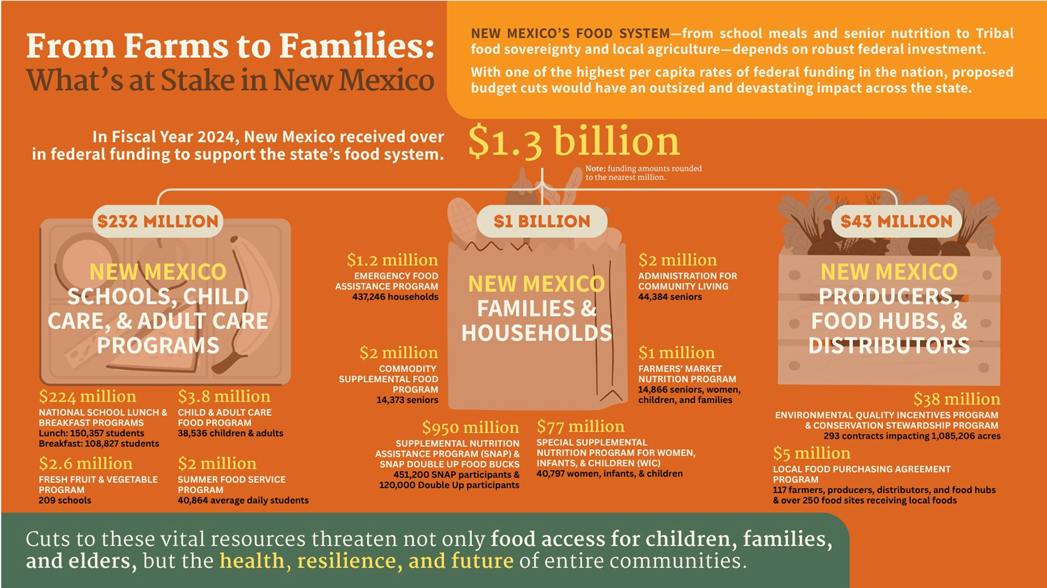 What are the implications for New Mexico’s nutrition programs, food assistance, and programs that benefit farmers and ranchers who are growing and raising food that benefits New Mexico’s food security and local economies? In FY2024, our state received close to $430 million in federal funding to support food, agriculture, and conservation programs. The federal cuts may force New Mexico to absorb significant additional costs.